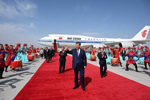 9月23日下午,中共中央總書記、國家主席、中央軍委主席習(xí)近平率中央代表團乘專機抵達烏魯木齊,出席新疆維吾爾自治區(qū)成立70周年慶祝活動。這是習(xí)近平走出艙門,向歡迎群眾揮手致意。新華社記者 畢曉洋 攝