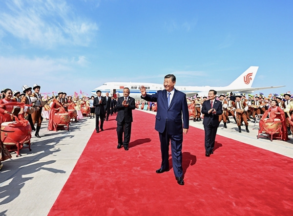 9月23日下午,中共中央總書記、國家主席、中央軍委主席習(xí)近平率中央代表團乘專機抵達烏魯木齊,出席新疆維吾爾自治區(qū)成立70周年慶祝活動。這是習(xí)近平走出艙門,向歡迎群眾揮手致意。新華社記者 燕雁 攝