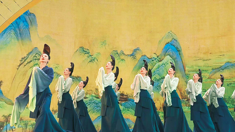 圖為圍繞傳世名作《千里江山圖》創(chuàng)排的舞蹈詩劇《只此青綠》亮相2022年中央廣播電視總臺春節(jié)聯(lián)歡晚會(huì)(視頻截圖)。中央廣播電視總臺供圖