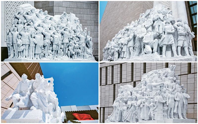 中國共產(chǎn)黨歷史展覽館西側(cè)廣場上矗立的《信仰》、《偉業(yè)》、《攻堅》、《追夢》四組大型雕塑,莊重巍然、充滿力量,講述著中國共產(chǎn)黨團(tuán)結(jié)帶領(lǐng)全國各族人民艱苦奮斗、不懈奮斗的歷程。圖為四組大型雕塑拼版照片。 劉新武/攝